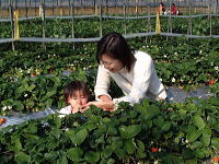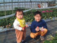 2002.1.28 いちごは見つかったなか?ちっちゃな娘さんが苺の苗で隠れていて最初見えなかったです。お母さんが最初、苺に話しかけているのかと思っ近づいたら!