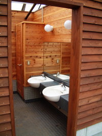 当園で行って参りましたお客様向けアンケートの結果、非常に多くの方々から清潔なトイレがほしいという要望を受け、2003年に木造トイレを新築しました。トイレの上部には、九十九里の海をイメージして鯨(クジラ)のデザインを採用しております。かなりの投資額になりましたが、お客様の満足度はそれまでの簡易式トイレとは雲泥の差が出ました。
